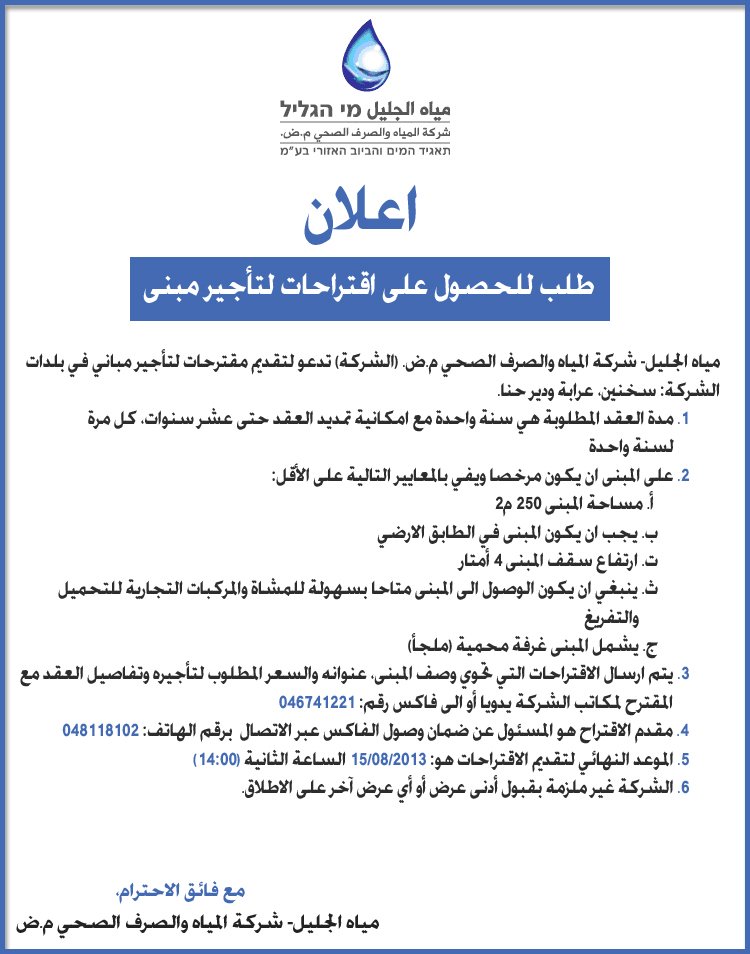 | קטגוריה: כללי | סוג המכרז: | תאריך פתיחת המכרז: 01/08/2013 | תאריך סגירת המכרז: 15/08/2013 |